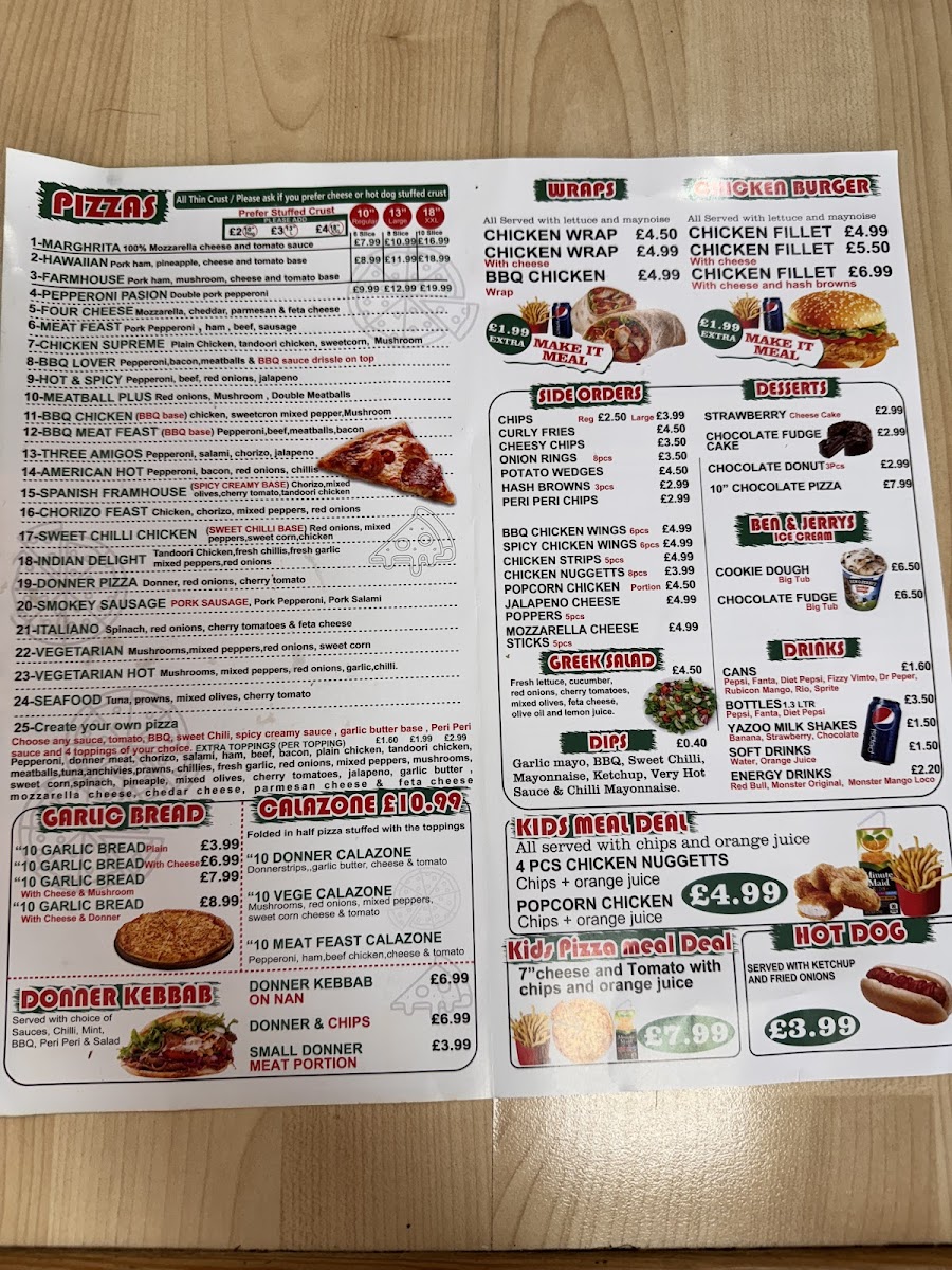 Pronto Pizza Express at La, 24 Berrycroft Ln offers a menu that caters to both classic tastes and more indulgent cravings. Their pizza selection includes staples like Margharita Pizza, Hawaiian Pizza, Farmhouse Pizza, Pepperoni Pasion Pizza, and Four Cheese Pizza, while calzone lovers can enjoy a 10" Donner Calazone, 10" Vege Calazone, or 10" Meat Feast Calazone. For burger fans, options such as the Chicken Fillet, Chicken Fillet With Cheese, and Chicken Fillet With Cheese & Hash Browns come either alone or as part of a Chicken Fillet Burger Meal. The wrap menu is equally varied, with Chicken Wrap, Chicken Wrap With Cheese, BBQ Chicken Wrap, Chicken Wrap Meal, and Donar Wrap available. Starters and sides include 10" Plain Garlic Bread, 10" Garlic Bread With Cheese, 10" Garlic Bread With Cheese & Mushroom, and 10" Garlic Bread With Cheese & Donner, complemented by regular and large chips, curly fries, cheesy chips, and 8Pcs Onion Rings. Those seeking kebab options can choose Donner Kebbab On Nan, Donner & Chips, or a Small Donner Meat Portion. The restaurant also caters to children with Kids 4Pcs Chicken Nuggetts Meal, Kids Popcorn Chicken Meal, and a Kids Pizza Meal Deal, while meal deals such as Pizza Meal Deal, Party Meal Deal, and Donner Meal Deal offer convenience and value. For lighter sides, there is Greek Salad, hot dogs, and a variety of dips including Garlic Mayo, BBQ Dip, Sweet Chilli Dip, Mayonnaise, and Ketchup. Desserts and treats feature Strawberry Cheese Cake, Chocolate Fudge Cake, 3Pcs Chocolate Donuts, and the playful 10" Chocolate Pizza, with ice cream options like 465ml Ben & Jerrys Cookie Dough Ice Cream and 465ml Ben & Jerrys Ice Cream. Milkshake enthusiasts can indulge in Banana Yazoo Milkshakes, Strawberry Yazoo Milkshakes, Chocolate Yazoo Milkshakes, or premium options like Oreo Milkshake, Ferrero Rocher Milkshake, Biscoff Milkshake, Snickers Milkshake, and Kinder Bueno. The menu is rounded out with soft drinks including 330ml Pepsi Can, 330ml Fanta Can, 330ml Diet Pepsi Can, 330ml Fizzy Vimto Can, and 330ml Dr Pepper Can. Overall, Pronto Pizza Express presents a menu that balances familiar comfort foods with creative twists, ensuring there is something to satisfy every craving.